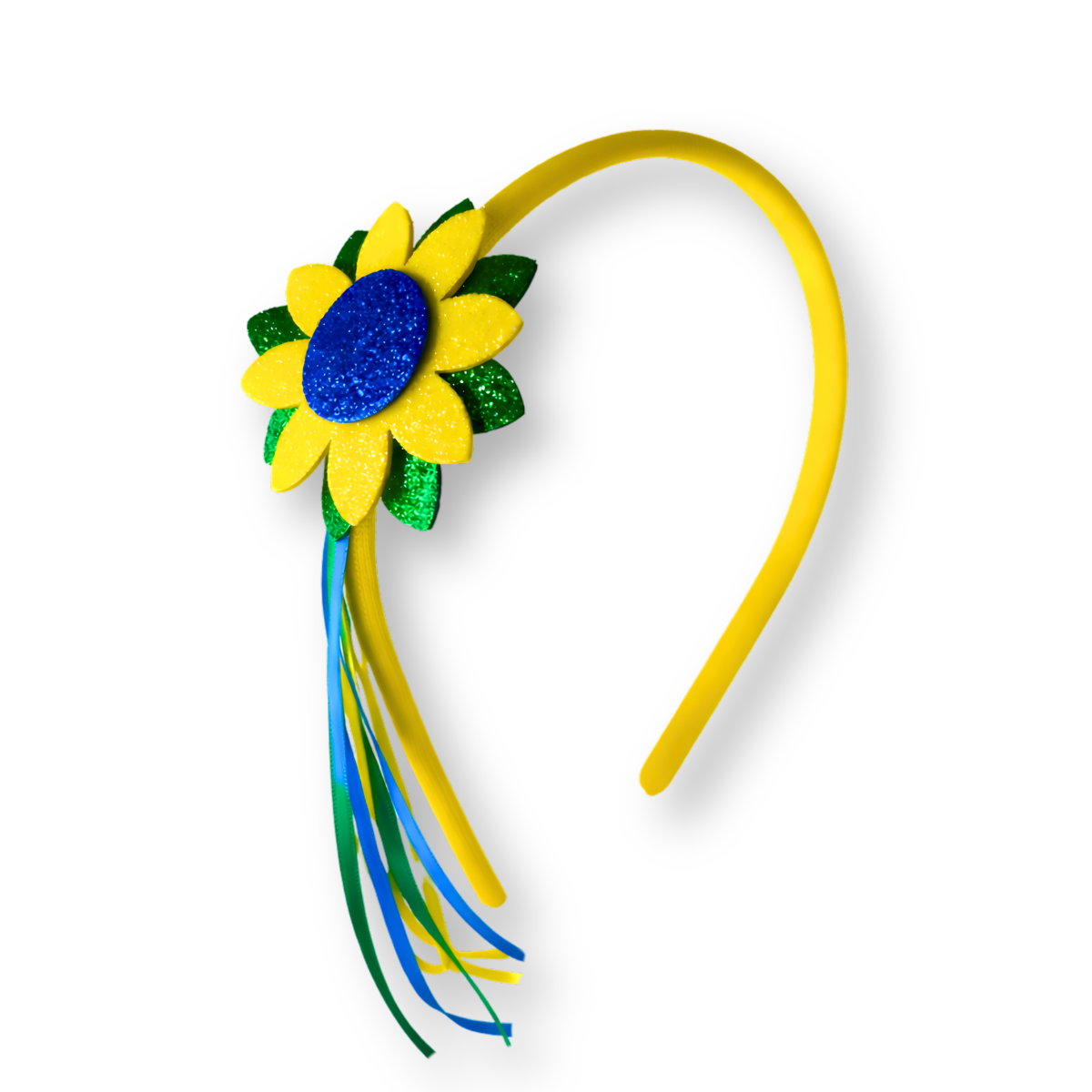 Deixe o visual ainda mais alegre e colorido com nossa linda tiara de girassol! Produzida com materiais leves e confortáveis, ela possui uma flor em EVA com glitter nas cores do Brasil e fitas decorativas que dão um toque especial ao acessório. Ideal para festas, eventos temáticos, torcida em jogos, apresentações escolares ou para completar produções criativas.