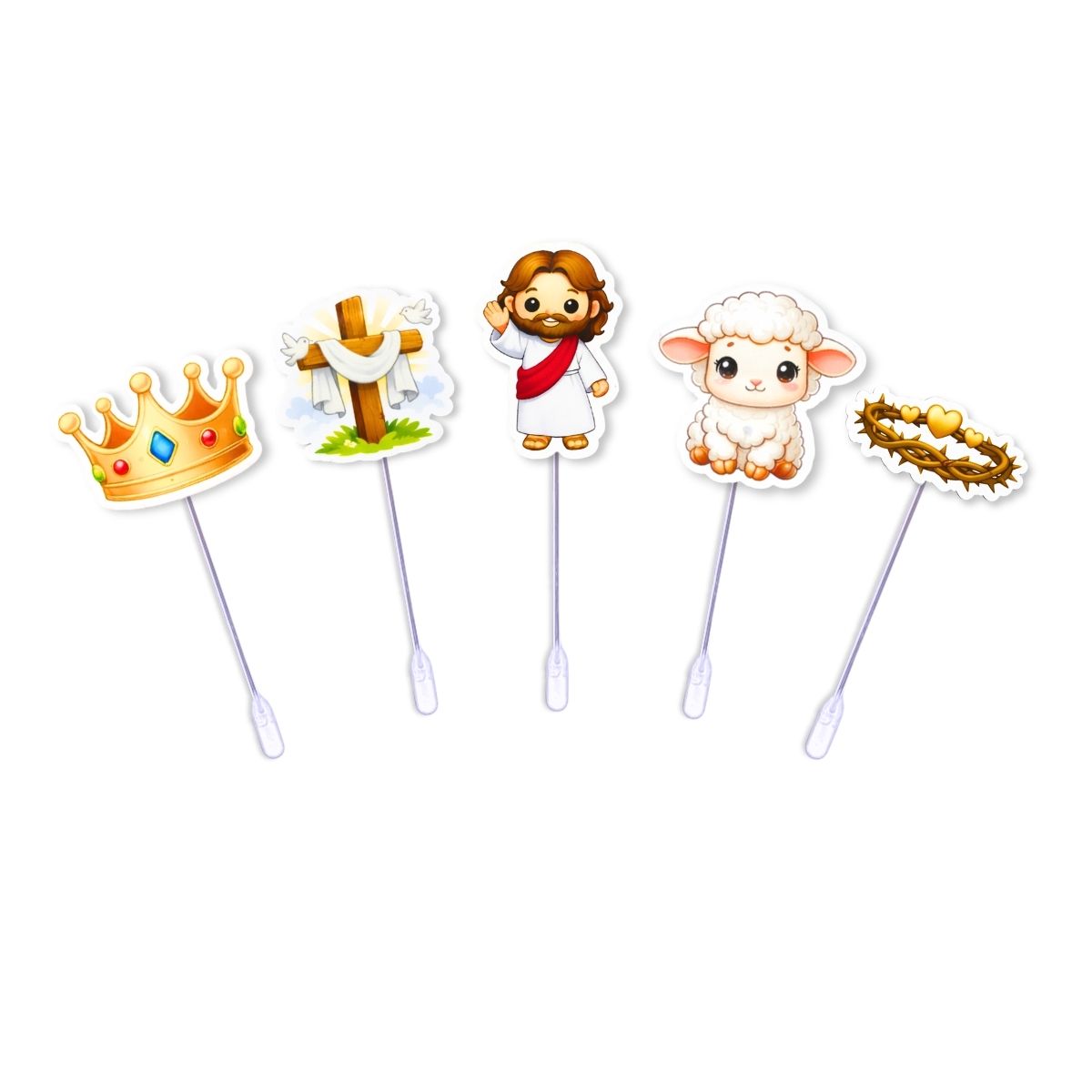 O kit contém elementos religiosos como Jesus, cordeiro, cruz, coroa e coroa de espinhos, representando a verdadeira essência da Páscoa.